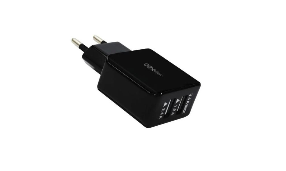 Carregador de tomada Duo USB Oex CG 201, possui 2 entradas USB (3.4A) que permite o carregamento simultâneo de 2 dispositivos. Recarregue seu disposit..